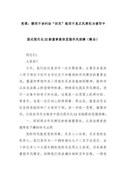/ 党课:锲而不舍纠治“四风”驰而不息正风肃纪为谱写中国式现代化XX新篇章提供坚强作风保障(精品)