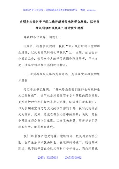 / 文明办主任关于“深入践行新时代党的群众路线、以优良党风引领社风民风”研讨发言材料