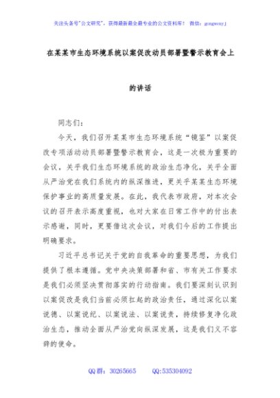 / 在某某市生态环境系统以案促改动员部署暨警示教育会上的讲话