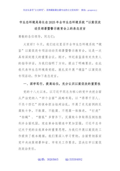 / 市生态环境局局长在2025年全市生态环境系统“以案促改动员部署暨警示教育会上的表态发言