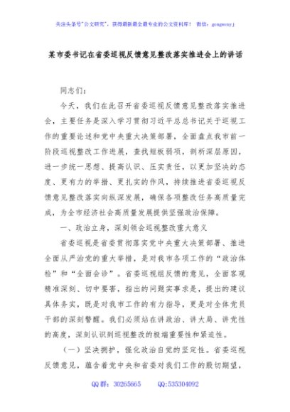 / 某市委书记在省委巡视反馈意见整改落实推进会上的讲话