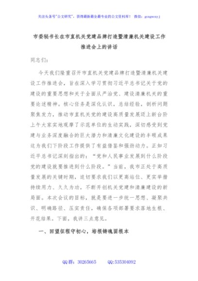 / 市委秘书长在市直机关党建品牌打造暨清廉机关建设工作推进会上的讲话