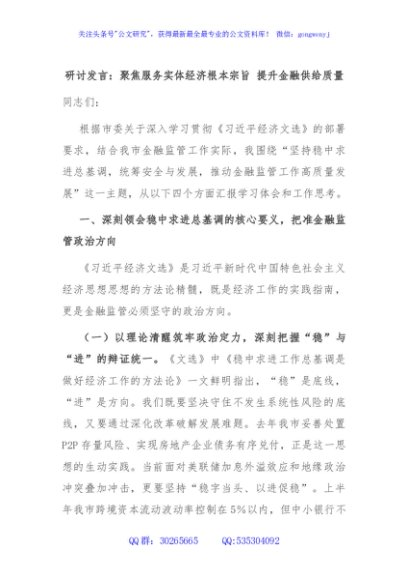 / 研讨发言:聚焦服务实体经济根本宗旨 提升金融供给质量