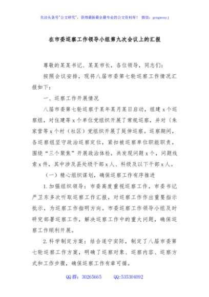 / 在市委巡察工作领导小组第九次会议上的汇报