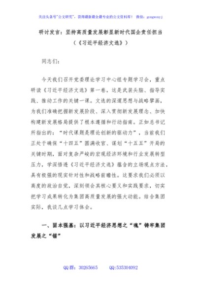 / 研讨发言:坚持高质量发展彰显新时代国企责任担当(《习近平经济文选》)