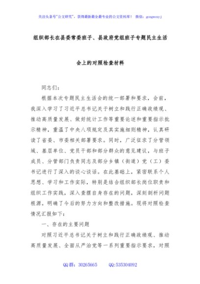 / 组织部长在县委常委班子、县政府党组班子专题民主生活会上的对照检查材料