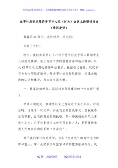 / 在审计局党组理论学习中心组(扩大)会议上的研讨发言(作风建设)