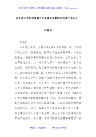 / 市长在全市安防委第二次全体会议暨防汛抗旱工作会议上的讲话