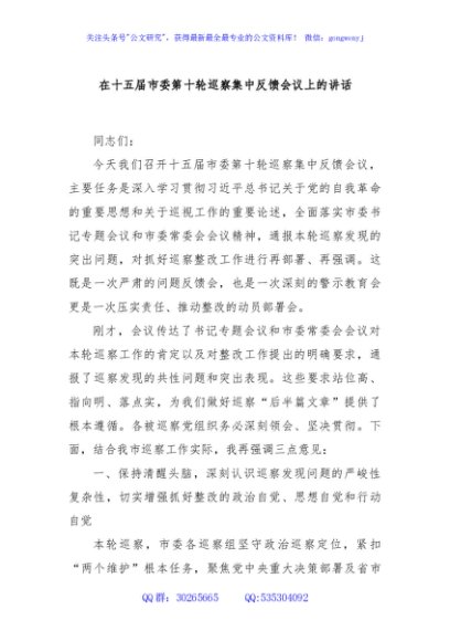 / 在十五届市委第十轮巡察集中反馈会议上的讲话