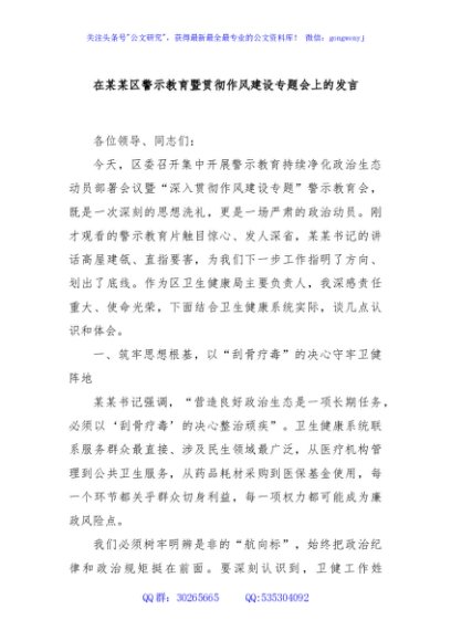 / 在某某区警示教育暨贯彻作风建设专题会上的发言