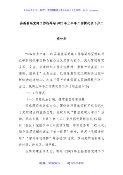 / 县委基层党建工作指导站2025年上半年工作情况及下步工作计划