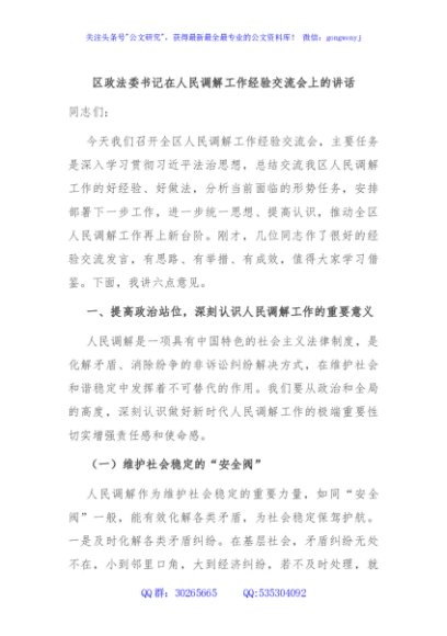 / 区政法委书记在人民调解工作经验交流会上的讲话