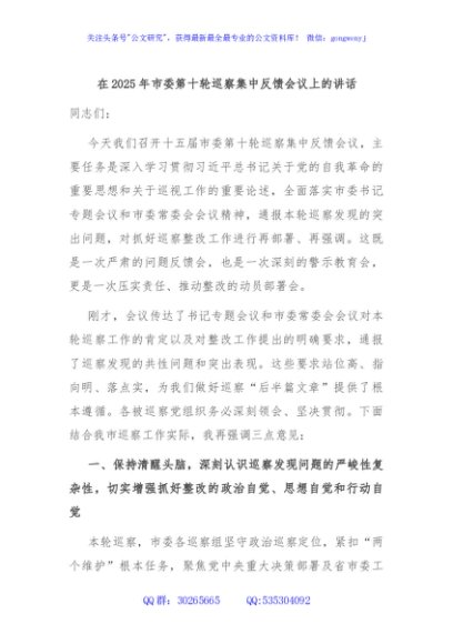 / 在2025年市委第十轮巡察集中反馈会议上的讲话