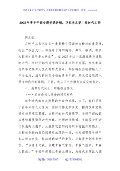 / 2025年青年干部专题党课讲稿。以担当之姿,赴时代之约