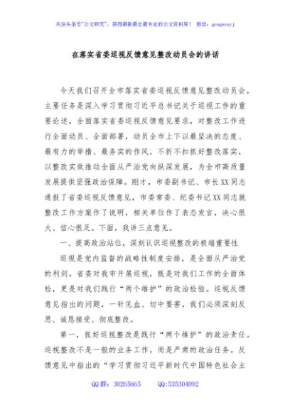/ 在落实省委巡视反馈意见整改动员会的讲话