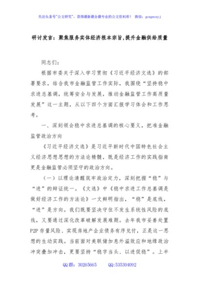 / 研讨发言:聚焦服务实体经济根本宗旨,提升金融供给质量