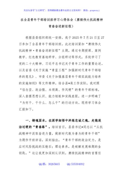 / 在全县青年干部培训班学习心得体会(赓续伟大抗战精神青春奋进新征程)