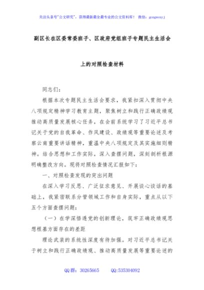 / 副区长在区委常委班子、区政府党组班子专题民主生活会上的对照检查材料