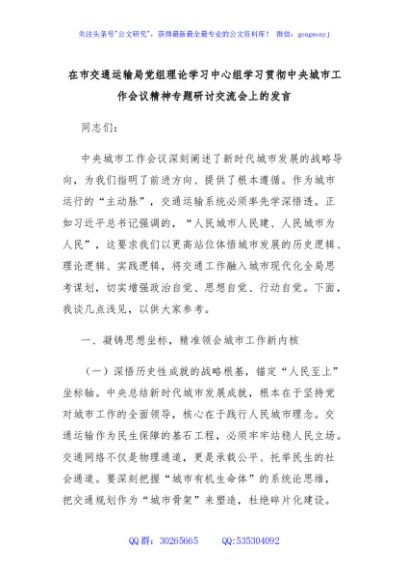 / 在市交通运输局党组理论学习中心组学习贯彻中央城市工作会议精神专题研讨交流会上的发言