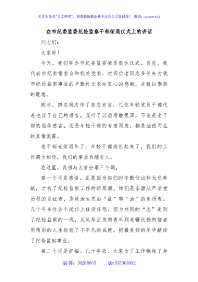 / 在市纪委监委纪检监察干部荣退仪式上的讲话