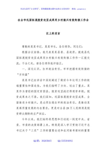 / 在全市巩固拓展脱贫攻坚成果同乡村振兴有效衔接工作会议上的发言