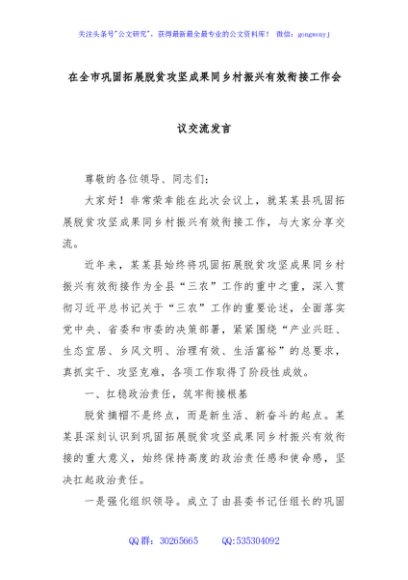 / 在全市巩固拓展脱贫攻坚成果同乡村振兴有效衔接工作会议交流发言