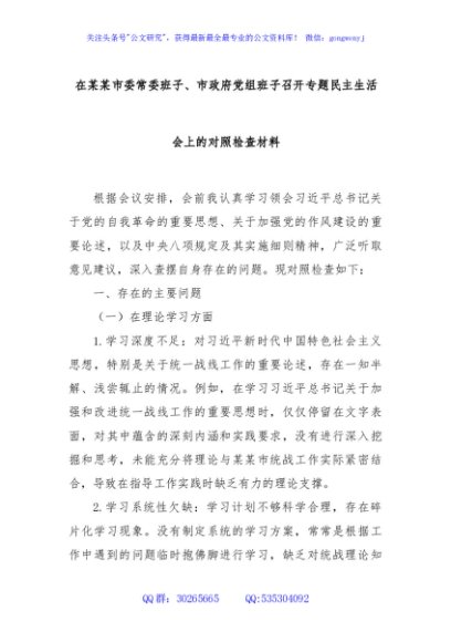 / 在某某市委常委班子、市政府党组班子召开专题民主生活会上的对照检查材料