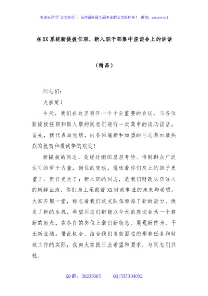 / 在XX系统新提拔任职、新入职干部集中座谈会上的讲话(精品)