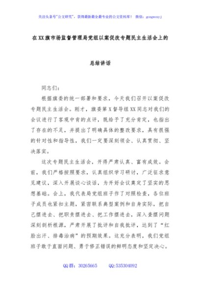 / 在XX旗市场监督管理局党组以案促改专题民主生活会上的总结讲话