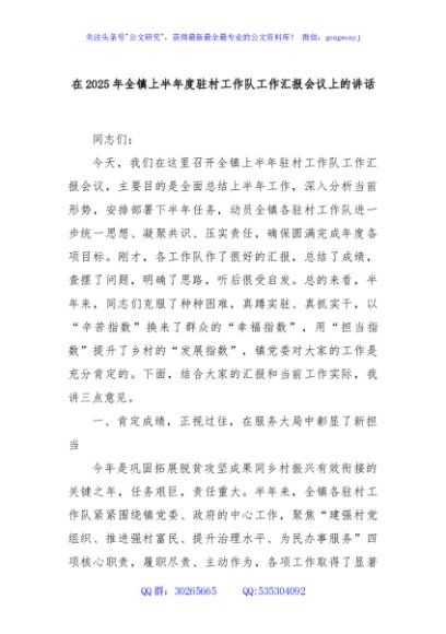 / 在2025年全镇上半年度驻村工作队工作汇报会议上的讲话