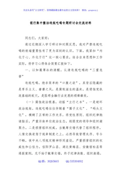 / 银行集中整治违规吃喝专题研讨会交流材料