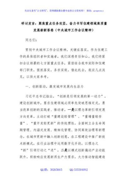 / 研讨发言:聚焦重点任务攻坚,奋力书写住建领域高质量发展崭新答卷(中央城市工作会议精神)