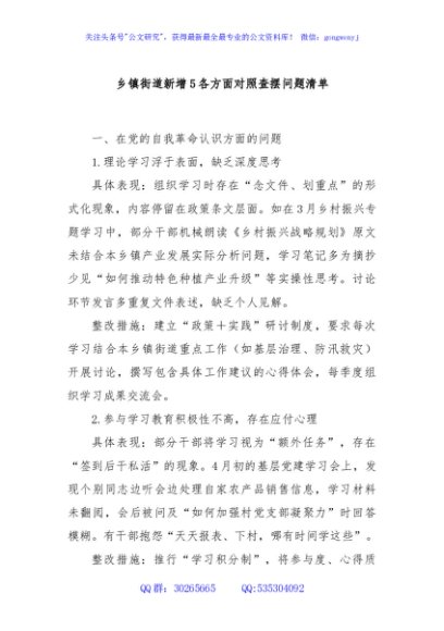 / 乡镇街道新增5各方面对照查摆问题清单
