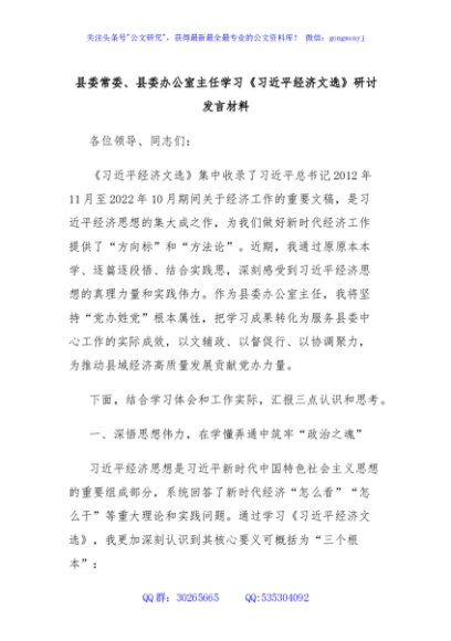 / 县委常委、县委办公室主任学习《习近平经济文选》研讨发言材料