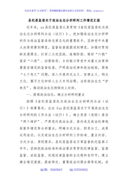 / 县纪委监委关于政治生态分析研判工作情况汇报