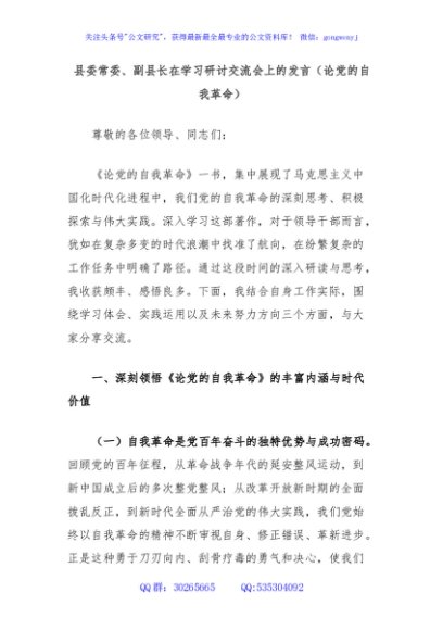 / 县委常委、副县长在学习研讨交流会上的发言(论党的自我革命)