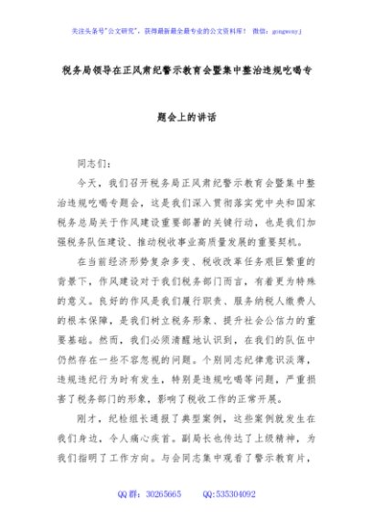 / 税务局领导在正风肃纪警示教育会暨集中整治违规吃喝专题会上的讲话