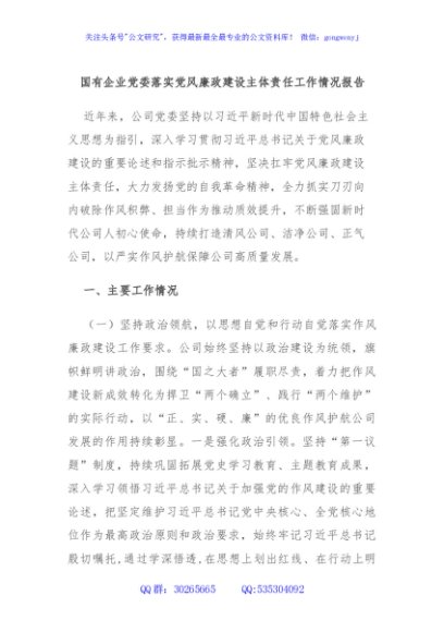 / 国有企业党委落实党风廉政建设主体责任工作情况报告