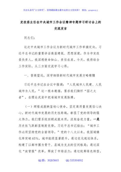 / 发改委主任在中央城市工作会议精神专题学习研讨会上的交流发言