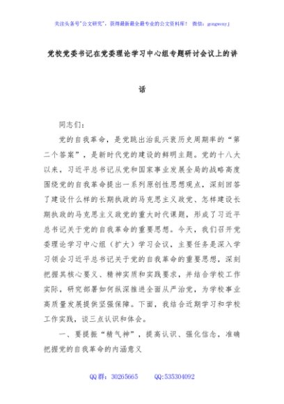 / 党校党委书记在党委理论学习中心组专题研讨会议上的讲话