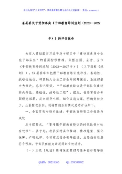 / 某县委关于贯彻落实《干部教育培训规划(2023-2027年)》的评估报告