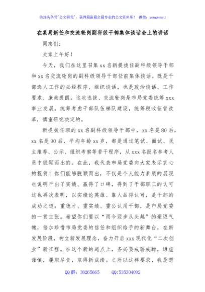 / 在某局新任和交流轮岗副科级干部集体谈话会上的讲话