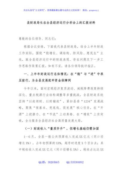 / 县财政局长在全县经济运行分析会上的汇报材料