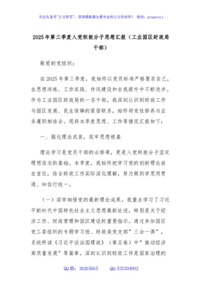 / 2025年第三季度入党积极分子思想汇报(工业园区财政局干部)