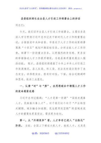 / 县委组织部长在全县人才引进工作部署会上的讲话