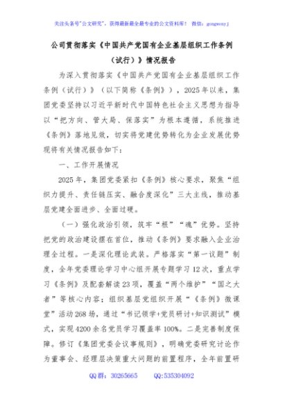 / 公司贯彻落实《中国共产党国有企业基层组织工作条例(试行)》情况报告