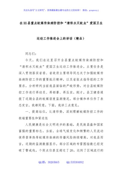 / 在XX县重点蚊媒传染病防控和“清积水灭蚊虫”爱国卫生运动工作推进会上的讲话(精品)