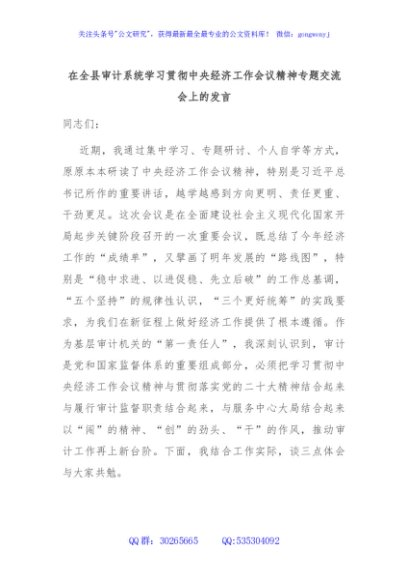 / 在全县审计系统学习贯彻中央经济工作会议精神专题交流会上的发言