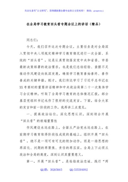 / 在全局学习教育回头看专题会议上的讲话(精品)