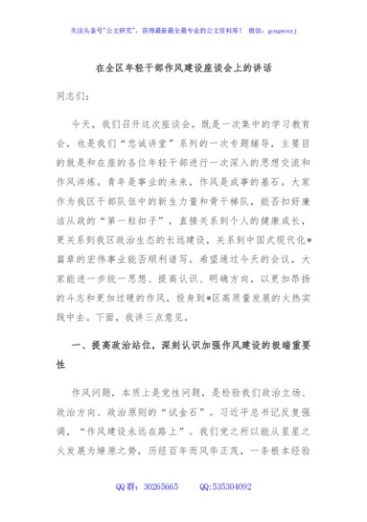 / 在全区年轻干部作风建设座谈会上的讲话